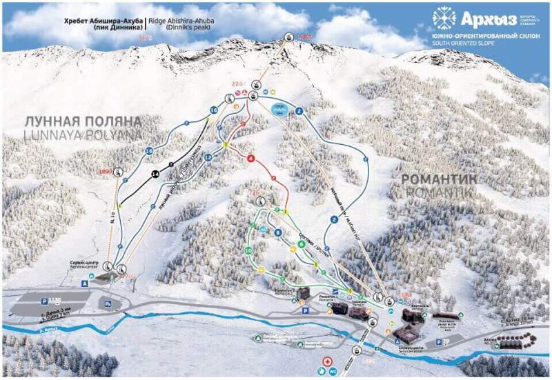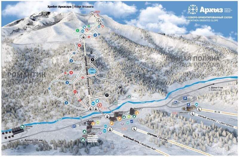 Архыз — небольшой, но очень уютный поселок, расположен в долине реки Большой Зеленчук, на высоте 1470 м. Архыз — один из самых молодых горнолыжных курортов в России. Работает на базе двух туристических деревень: «Романтик» и «Лунная поляна». Трассы расположены на южном и северном склонах. Их обслуживает 4 канатные дороги. Две гондольные, где пассажиры едут в 6 местных кабинках, и две кресельные.