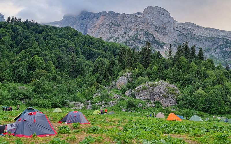 4 деньЗавтрак. Прогулка (без рюкзаков) на Фишт-Оштеновский перевал (2200м). По желанию группы, возможна прогулка к озеру Псенодах или к малому леднику горы Фишт. Обед – перекус. Возвращение в лагерь. Ужин, отдых.