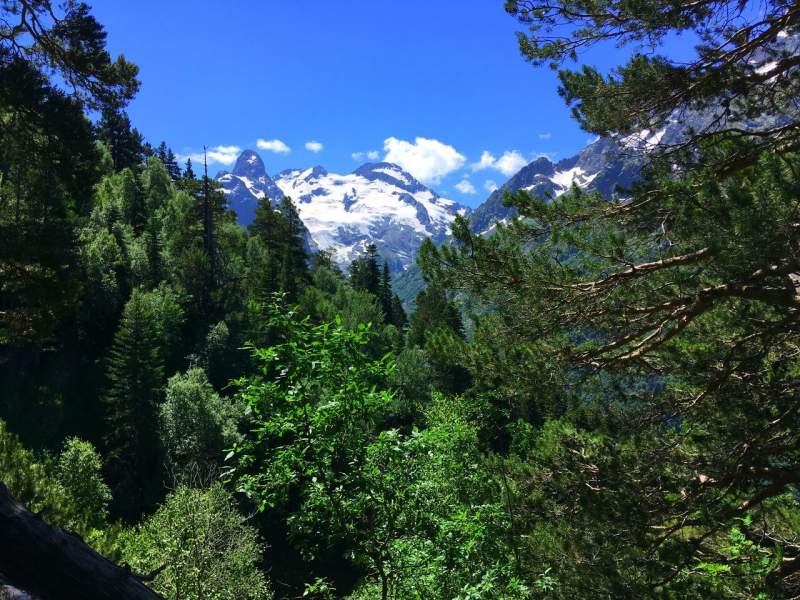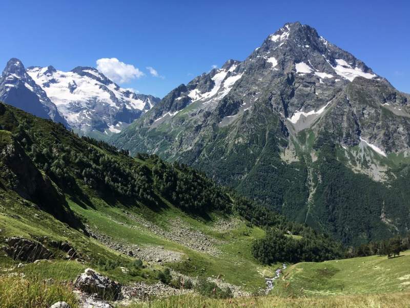Неделю туристы проведут в сказочной стране в окружении снежных вершин. Увидят, как белые струи водопадов с шумом срываются с огромной высоты, на которой расположен ледник горы София. Путешественники смогут полюбоваться панорамой Главного Кавказского Хребта с высоты несколько тысяч метров и искупаться в чистейших сине-зелёных горных озёрах.